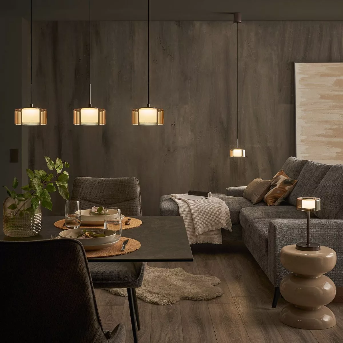 Dank der Comfort-Lift-Funktion lässt sich die Höhe der Pendelleuchte jederzeit stufenlos verstellen, sodass sie sich perfekt an verschiedene Raumhöhen anpassen lässt. Die Leuchte ist zudem über den Wandschalter stufenlos dimmbar, was eine individuelle Lichtgestaltung ermöglicht. Die Memory-Funktion speichert die zuletzt gewählte Helligkeit, sodass Sie immer Ihre bevorzugte Einstellung gespeichert haben.