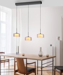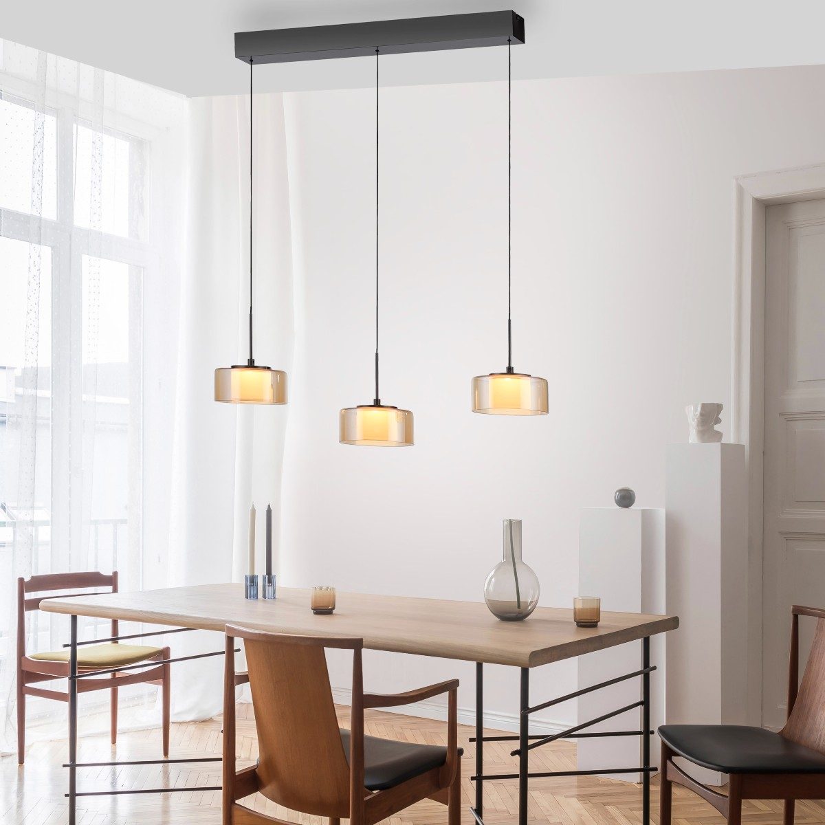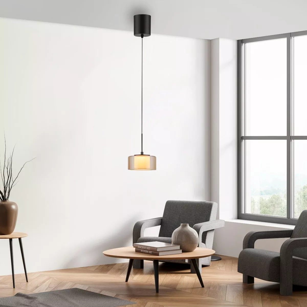 Die Pendelleuchte besitzt elegante Lampenschirme aus einem Opalglas und einem ihn umschließendem Glas aus Amber. Die Kombination aus Opalglas und Amber verleiht der Leuchte einen besonderen Charme und macht sie zu einem echten Hingucker.